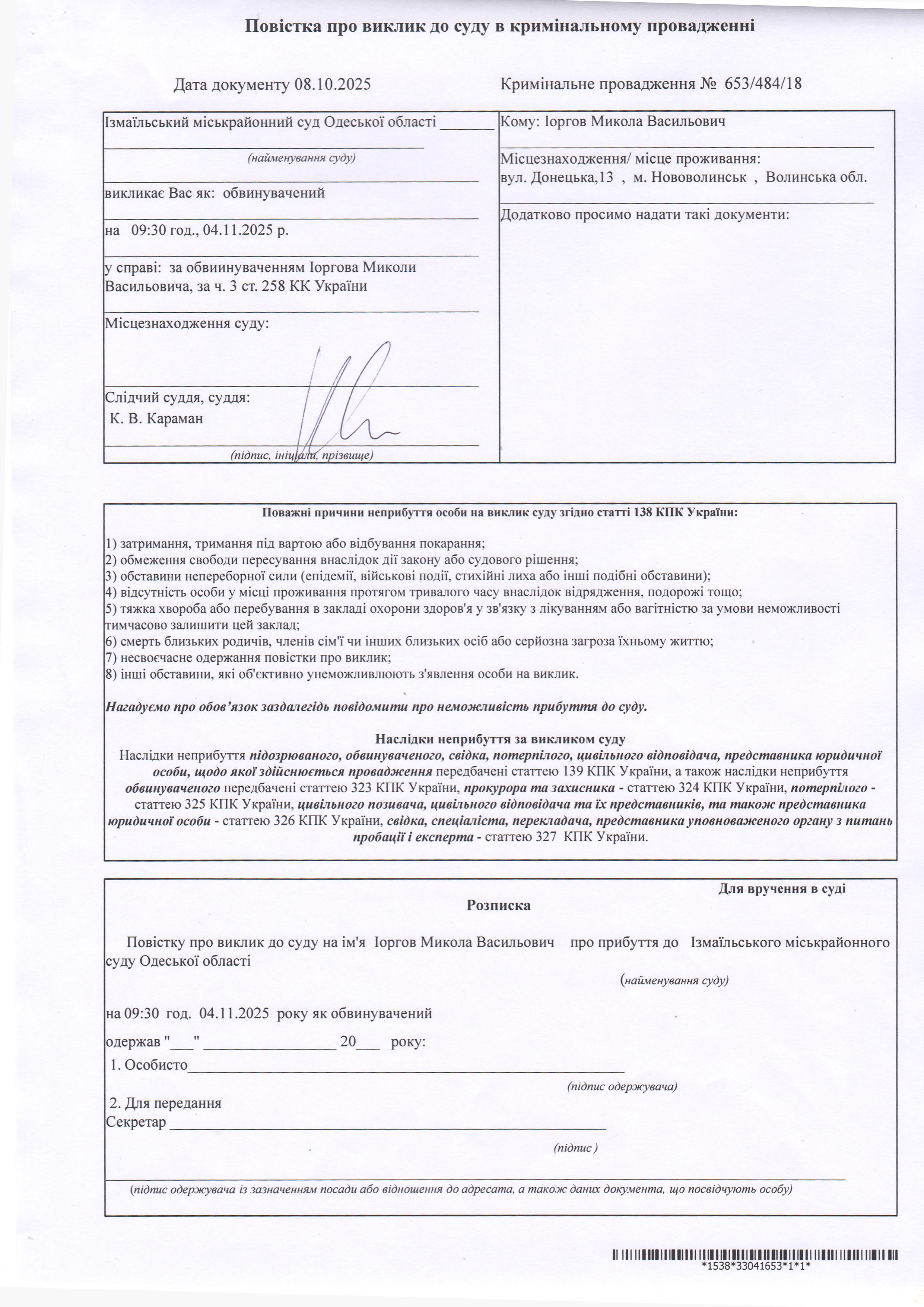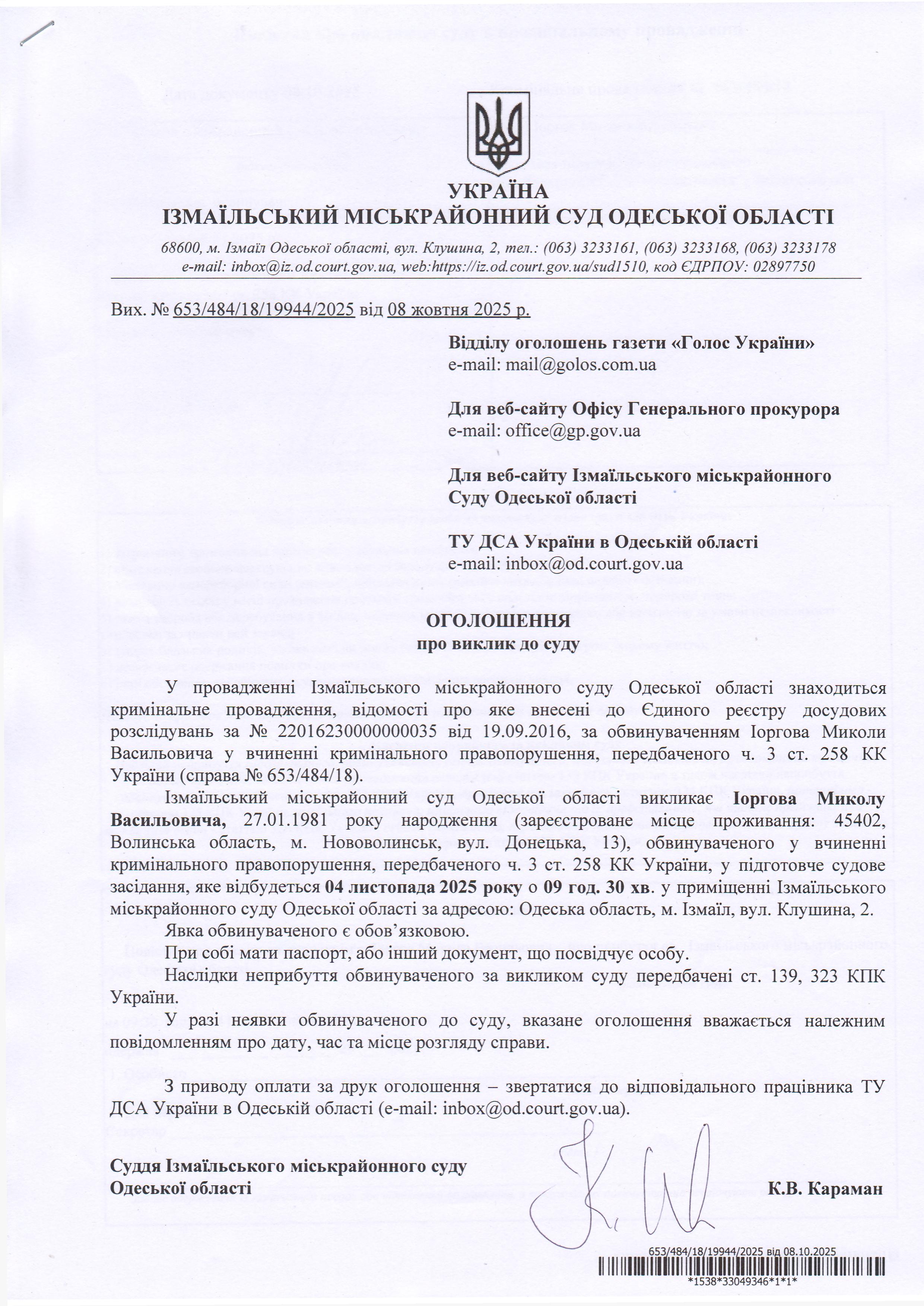 Оголошення про виклик у судове засідання Іоргова М.В.