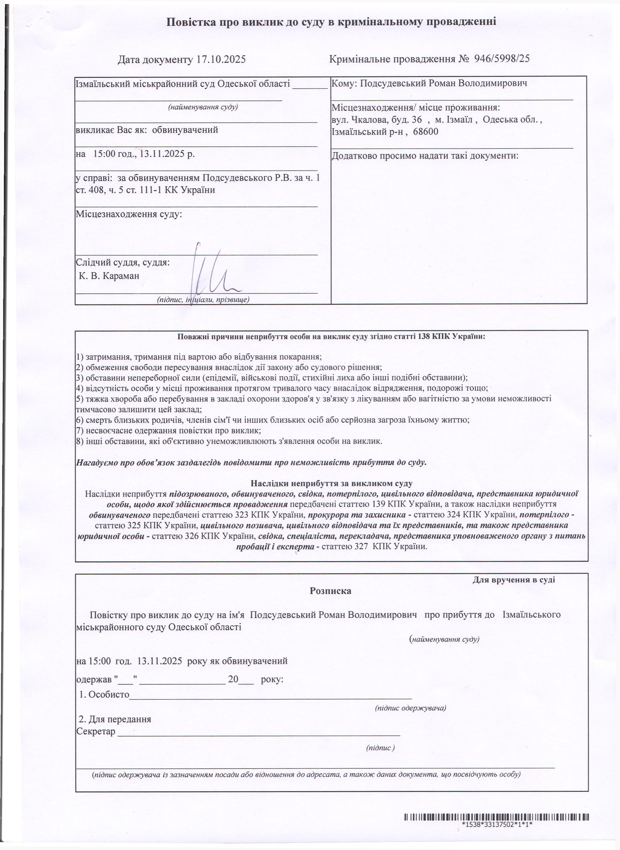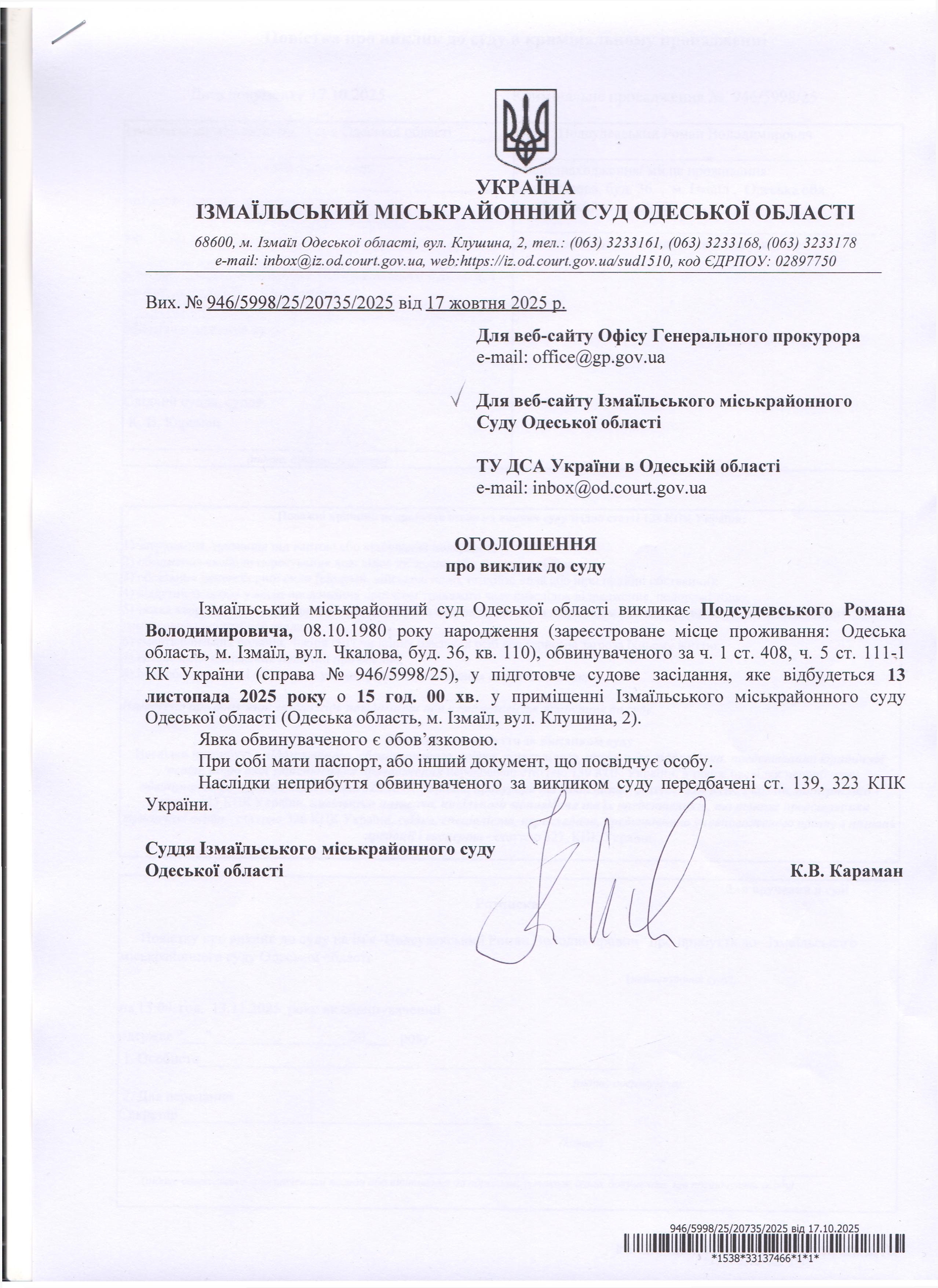 Оголошення про виклик у судове засідання Подсудевського Р.В.