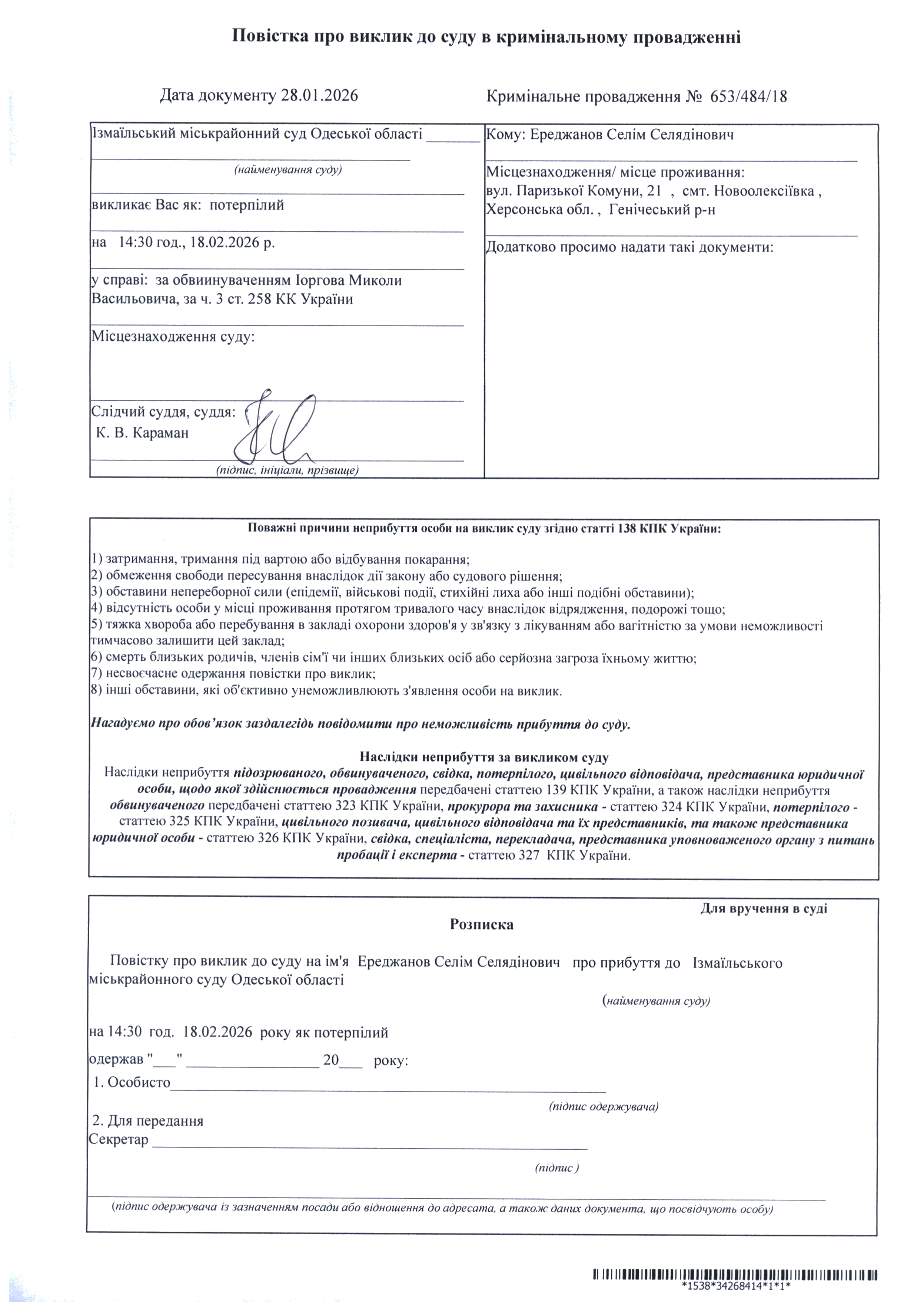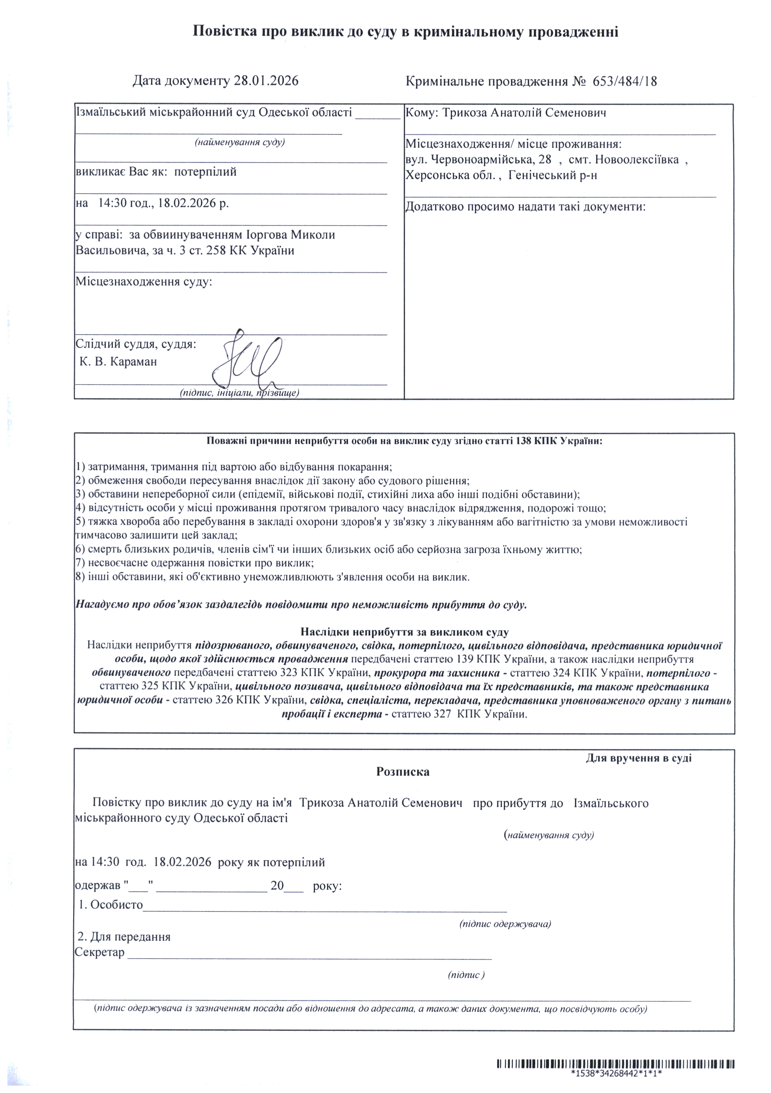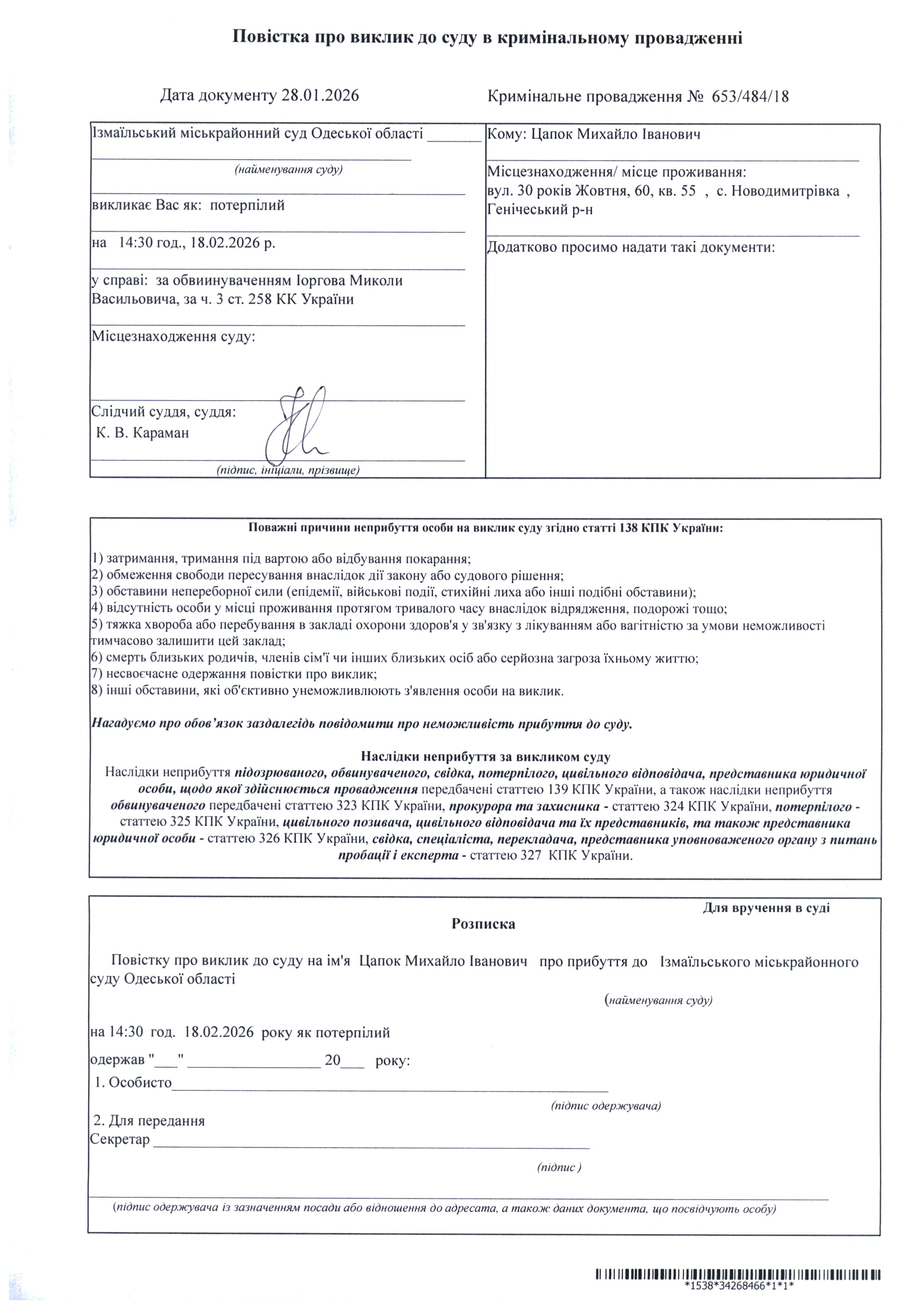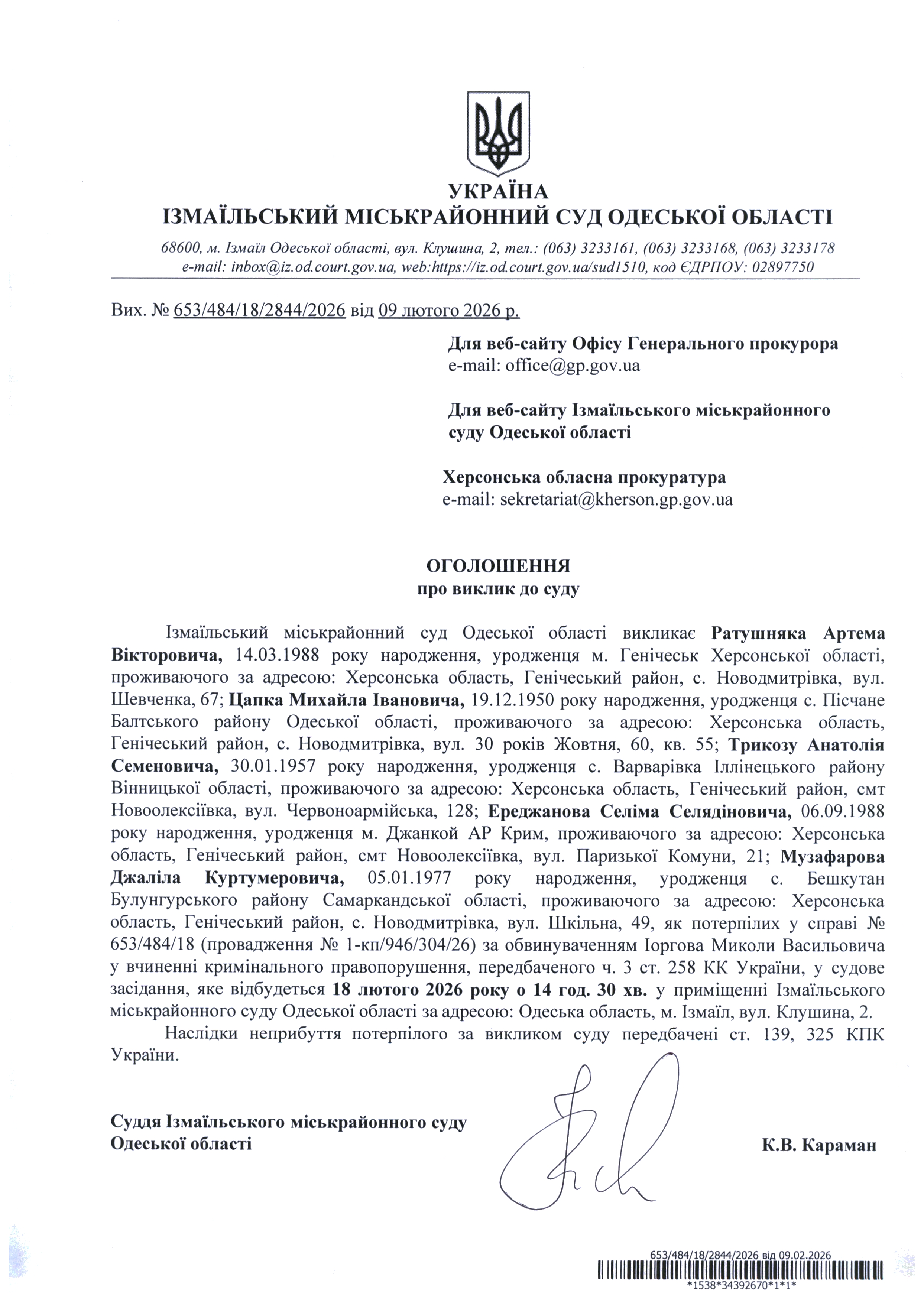 Оголошення про виклик у судове засідання Ратушняк А.В., Цапка М.І., Трикозу А.С., Ереджанова С.С., Музафарова Д.К.