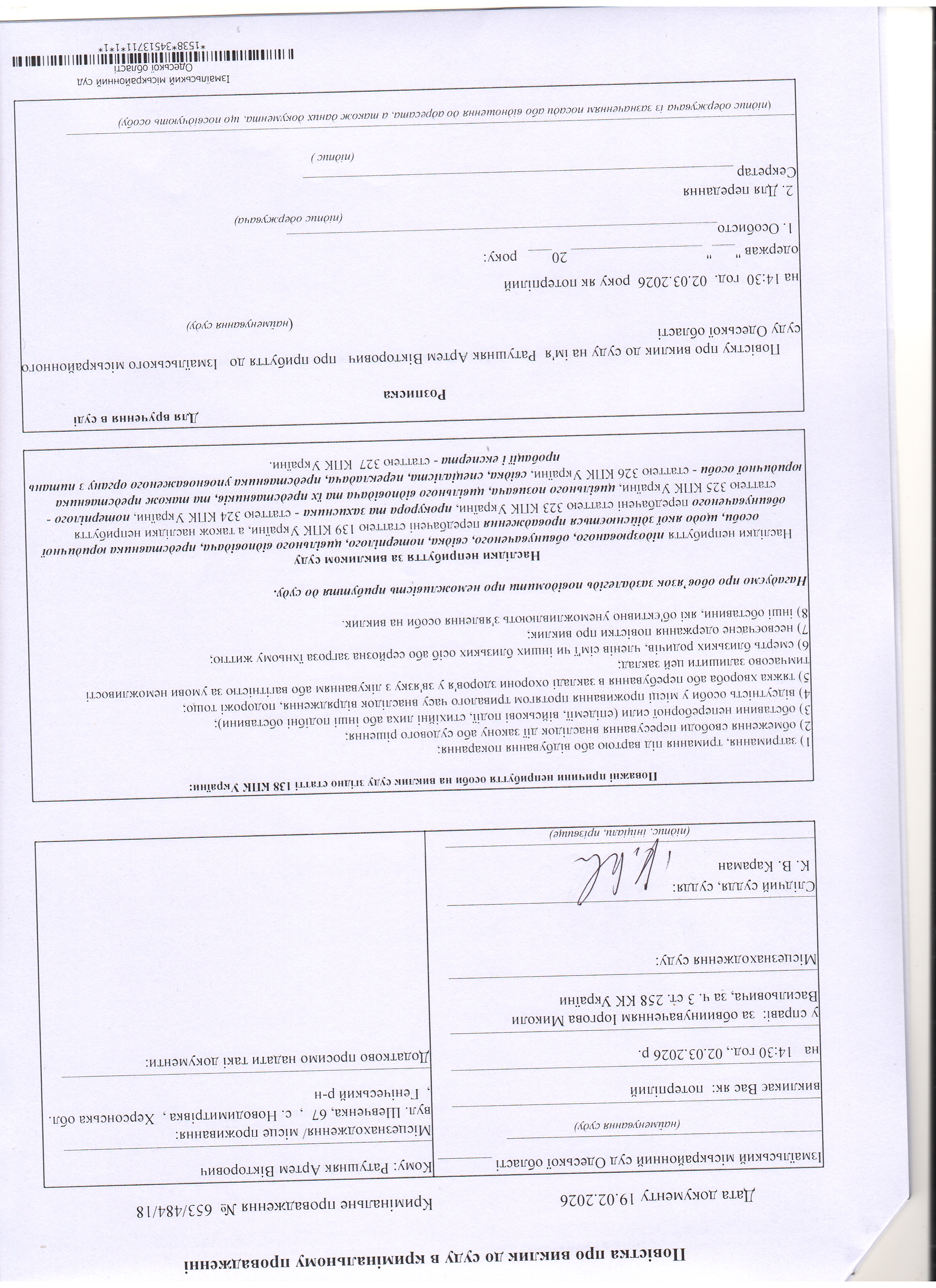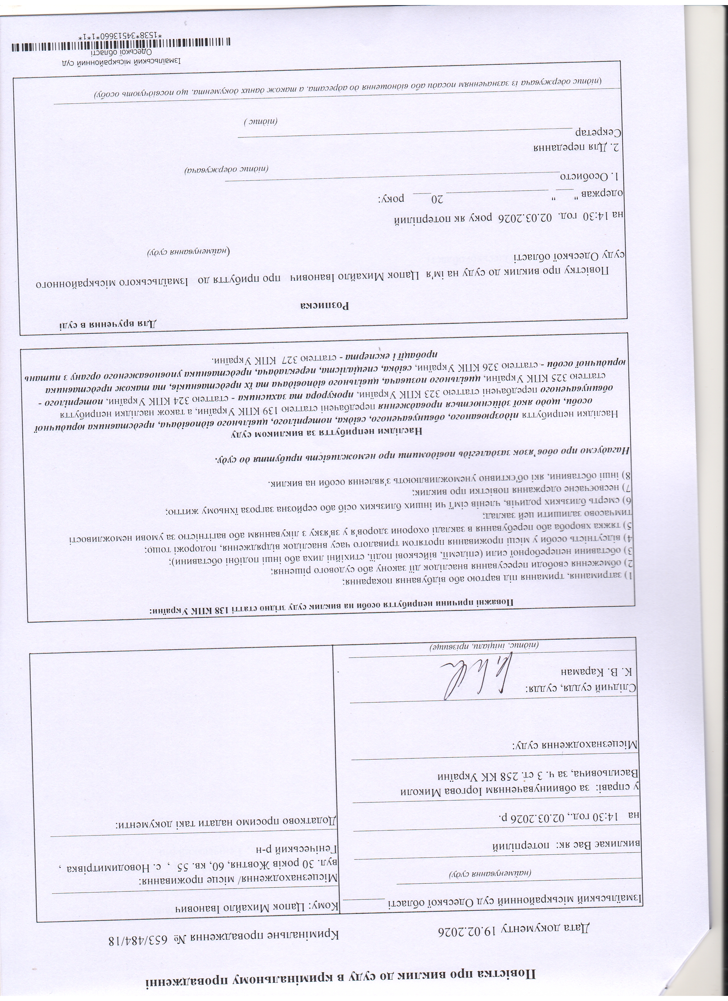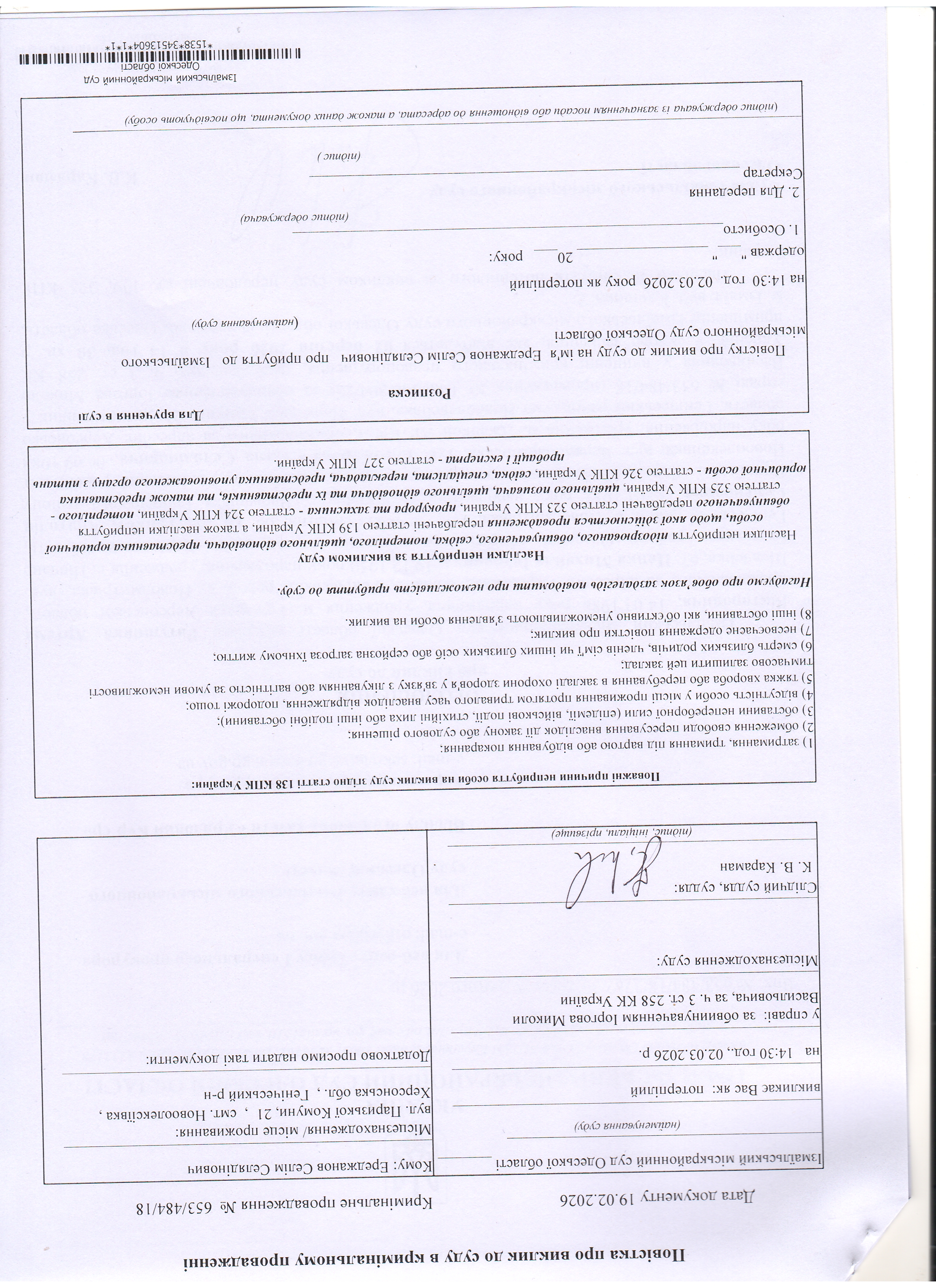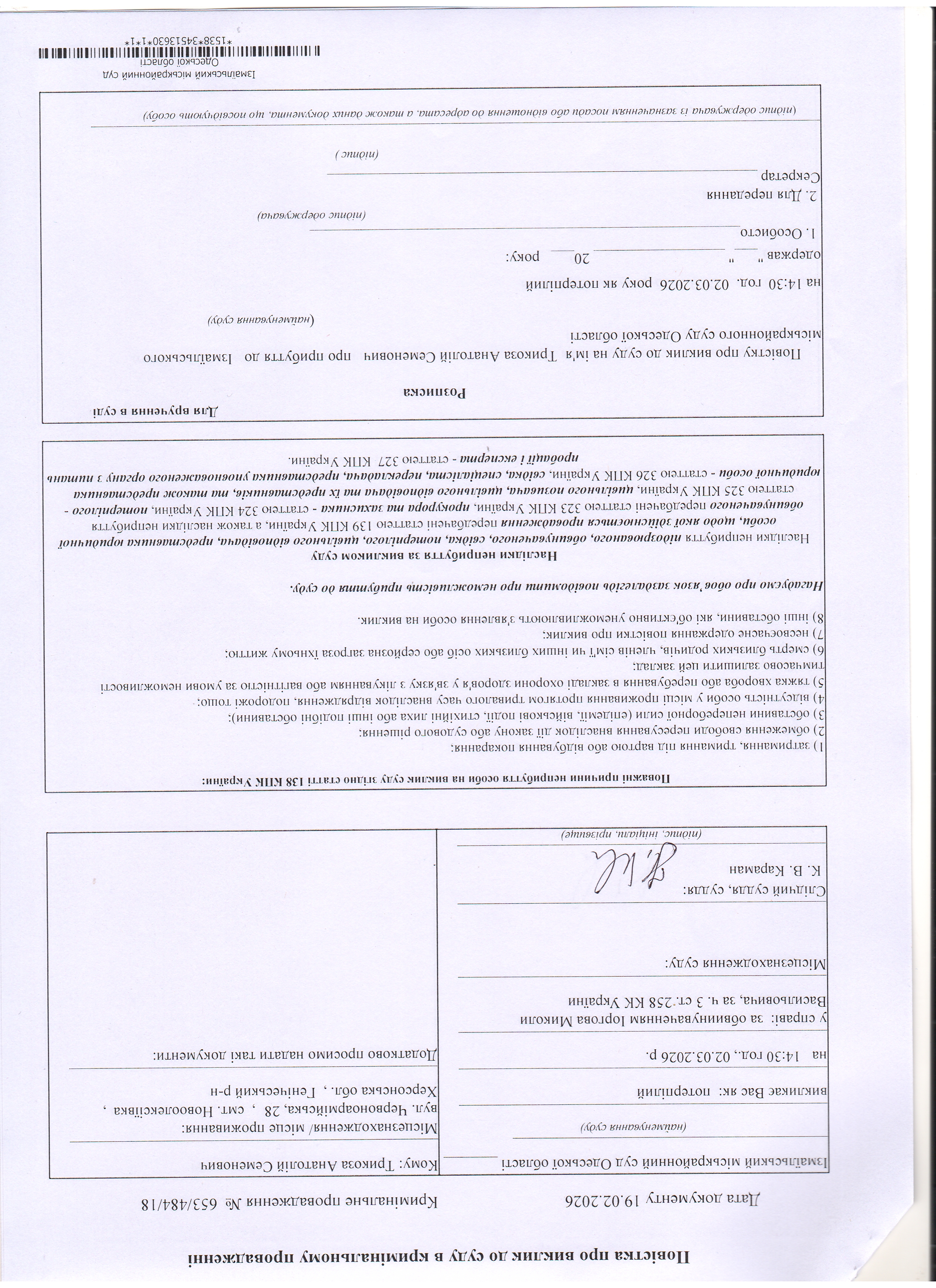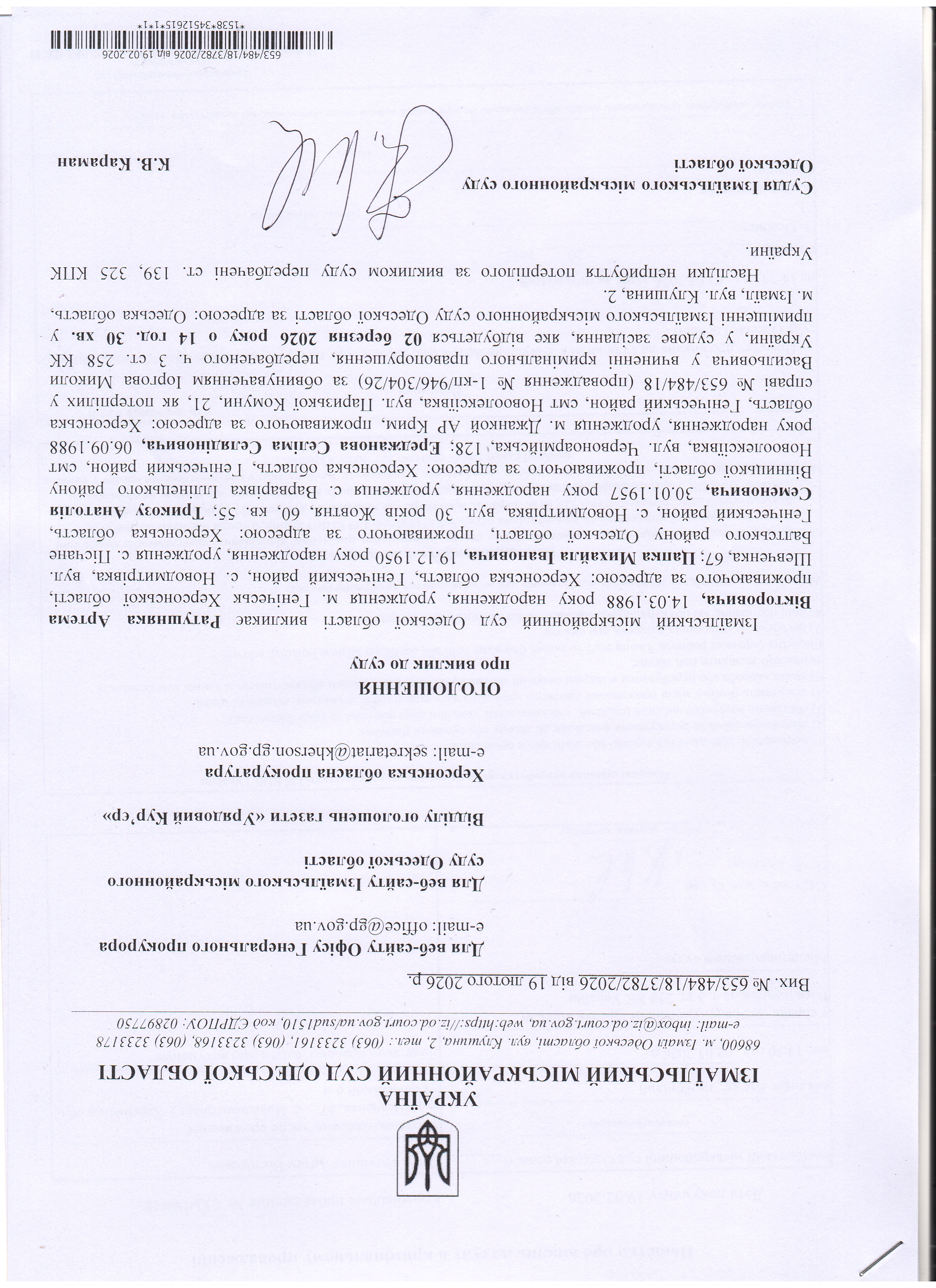 Оголошення про виклик у судове засідання Ратушняк А.В., Цапка М.І., Трикозу А.С., Ереджанова С.С., Музафарова Д.К.